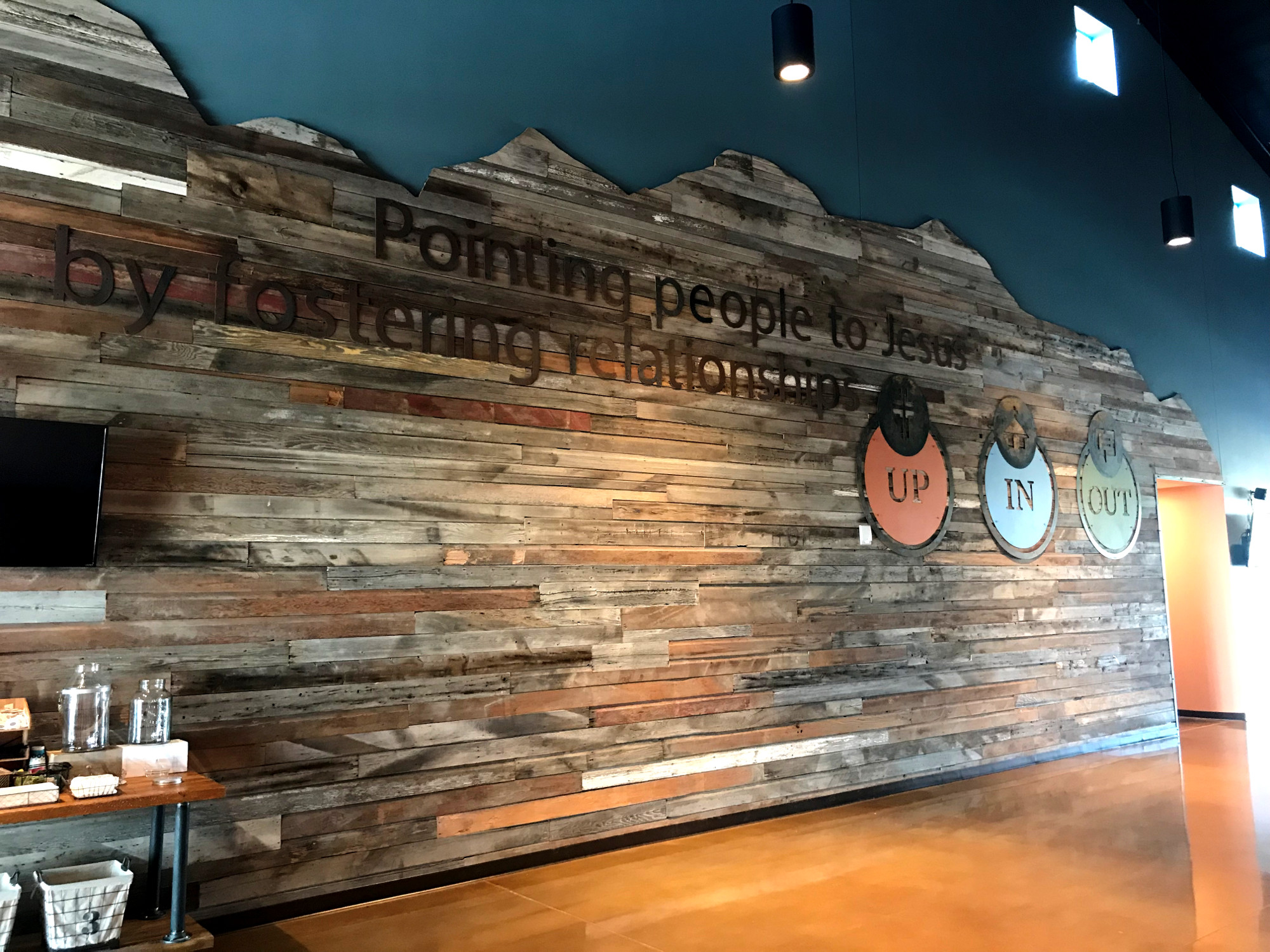 Mountain View Fellowship in Strasburg, CO recently opened a new worship center and decided to use a rustic steel on barn board motif for all their interior signage. Colorado WaterJet cut all the letters and other signage for this church’s project.